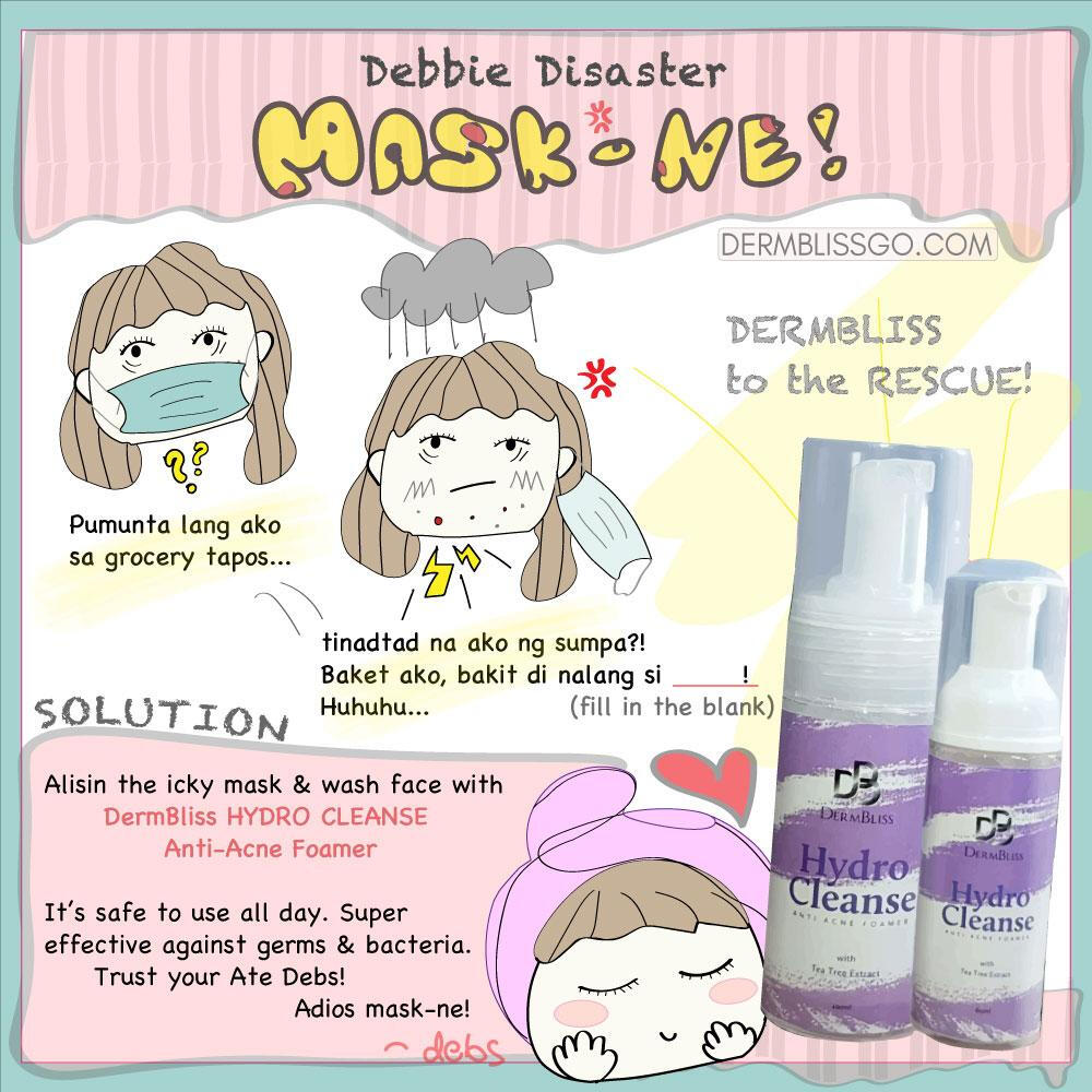 Why, oh, why!Besh, kung yung wala pang cover ang face natin, may tumutubo nang undesirable, di ba? So imagine pag may mask pa... combined with the oils in our face, plus sweat, and the stale air = it's the perfect breeding ground for bacteria. Kaya tiba-tiba the pimples at mabilis syang tutubo, at magmu-multiply... huhuhu.. I feel you!Well payong Debs lang ha... best way to minimize mask-ne is to always wear fresh face masks... pag may moisture na, change na besh! So make baon fresh masks, and don't make ulit pag dirty na please!Of course, wash your face agad after removing the mask. And DermBliss Hydro Cleanse Anti Acne Foamer is the best companion for your face... it's mild but ready to fight those nasty bacteria. You can wash your face with it as often as you want, and hindi nakaka-dry ng skin. I love it besh!