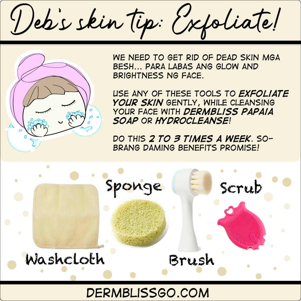 I'm so stressed Deebies! I know hindi lang ako... and you know what suffers kapag haggard tayo? Our skin, 'di ba? Like oh my, nagugulat na lang ako minsan pag tingin sa mirror, at walang kaglow-glow ang skin ko.Someone asked me bakit daw parang dark and makulimlim ang face nila kahit they're using the DermBliss set faithfully. Alam nyo may suggestion ako dyan! Need lang ng skin natin ng extra boost, lalo na when our pores are clogged with dead skin cells. Hindi lang mukhang haggard - minsan medyo dark ang face, dry, flaky and patchy dahil yung dead skin bino-block ang pores. So hindi makapasok yung nutrients and ingredients ng skin products natin. Less effective ang skin regimen pag ganun.We need to EXFOLIATE - yes, get rid of that layer of dead skin cells, and do this 2-3 times a week para laging healthy ang skin. At dahil clean ang pores after exfoliating, mas maa-absorb rin ng skin yung mga pinapahid natin besh. Ayun, instant glow and maaliwalas effect.You'll see the difference agad. If sensitive ang skin mo, make sure to use the gentlest washcloth to exfoliate your face. Don't use anything too abrasive dahil imbes na ma-wash away lang ang dead skin, e baka magka mini tears and scratches ka sa face. There are also soft sponges and face scrubs that we can use. And of course, different kinds of skin brushes for deep cleaning. These tools are avaibale naman everywhere (like Shopee!) - just follow the instructions for how to use your exfoliating tool properly. Be sure to use DermBliss facial cleansers para clear, bright and fresh na fresh ang skin!So I'm off to wash and exfoliate my haggard face mga besh. Don't forget to visit our Shopee before the sale ends Deebies!