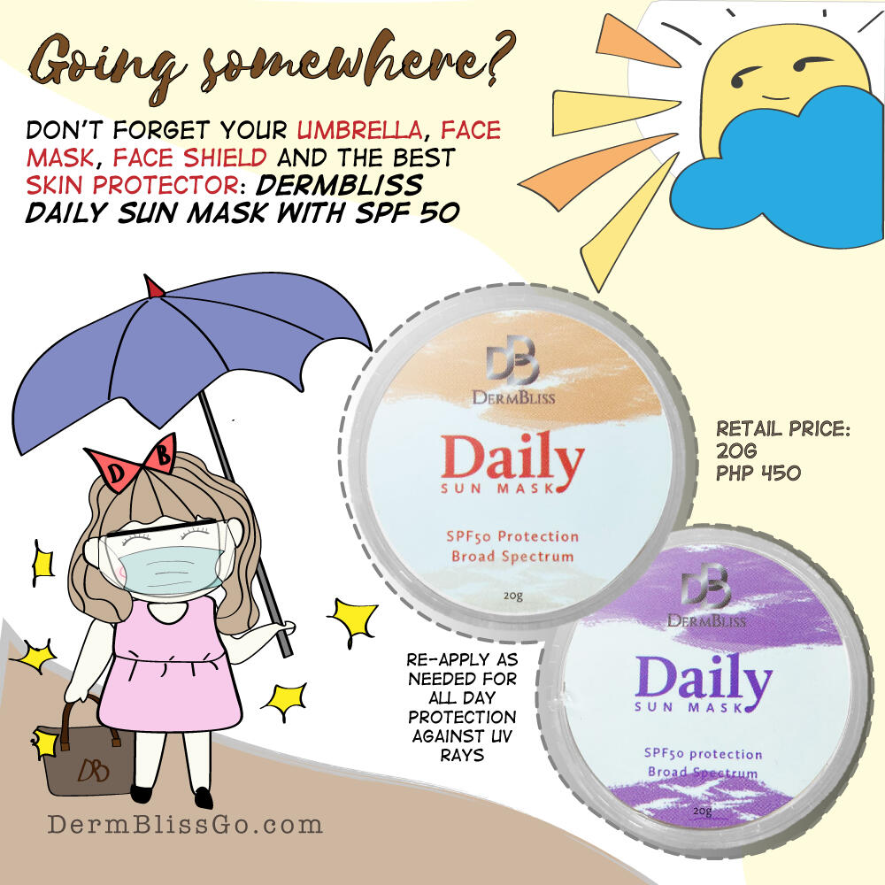 Hello Deebies! It's me, Debs - your favorite nagger in the world.Undas na mga besh... and time to make dalaw our loved ones in the cemetery. As always, when going out these days, dapat bitbit all the essentials like drinking water, alcohol, wipes and tissues. Then we have to wear face shield and face mask rin. At dahil super init, we also have to carry payong!Sobrang dami, right? Halos sasabog na ang bag ko e I need space for snacks! Bawal me magutom because it's dangerous sa mga taong nakapaligid sa akin.Pero alam nyo what else I don't forget to put in my bag? Ciempre, the cream that will protect my skin from the sikat ng araw: DermBliss Daily Sun Mask with SPF 50. Naku, even a few minutes direct exposure to the sun can harm the skin... As in, the rays of the sun can damage skin cells and as a result, we'll get dry, patchy, haggard looking skin. For some, they experience skin darkening dun sa spots na exposed sa sun so they'll get uneven skin complexion pa. Kaya besh, invest on a good barrier against the sun dapat and never leave home without it.