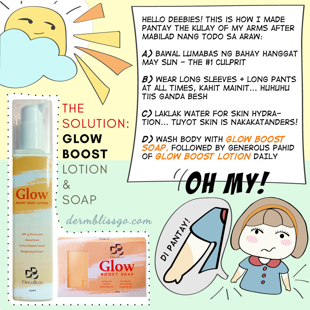 Guess who received a letter from a fellow Deebie? Of course, yes - it's me who else?! Anyway, according to our letter writer, Angel (not her real name...), hindi pantay ang kulay ng arms nya. Every morning, she goes jogging and stretching in their garden, for up to two hours. Ayan ang napapala mo sa kae-exercise besh... char! Joke lang! Dahil masipag si Angel beshie, mas dark ang lower arms nya compared sa upper arms nya, and she wants to know how to make it pantay before Christmas. Tsk, tsk...Okay lang yan, Angel.. hindi ka nag-iisa. In fact, I used to bilad myself to the sikat ng araw all the time... no, hindi ako nage-exercise... naglalakad lang ako na parang normal na tao sa BGC. Pero walang patawad etong si sun and before I knew it... nag-darken ang arms and feet ko ng mga 2-3 shades! When we get exposed to the sun kasi, harmful ultraviolet rays damage our skin and it gets darker. So how can we avoid this? Here are some tips:Hindi lang mabilis makaputi ang Glow Boost soap and lotion tandem, Deebies - it also has SPF45 protection from UV radiation which is very important. Make sure to use it daily para bumalik ang dating anyo. The more sipag, the more mabilis and if you start now, I'm sure pantay and glowing na everything by Christmas time. These days, pag hindi maiwasang lumabas, I never leave the house without my payong and DermBliss Glow Boost Lotion. I hope this helps everyone!