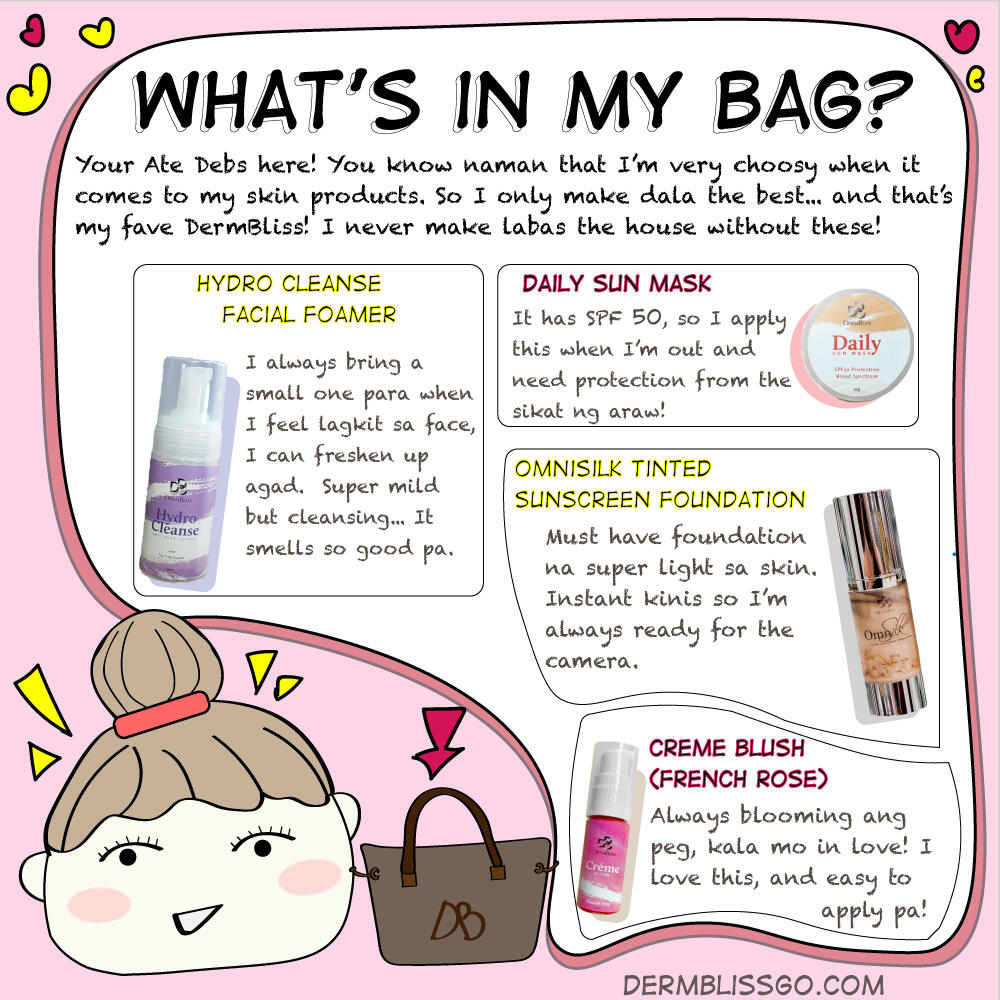 I'm here again, Deebies! Sooobrang busy ng week ko... ciempre, nag-sale ang DermBliss so I had to buy sets for me and the whole angkan. I can't resist kasi e... But no, it's not yet over. Tomorrow is the 10/10 sale! Kaya nakaabang na me sa Shopee and Lazada. Excited much ba?!Anyway, someone asked me: "Ate Debs, what's in your bag?" Char! Feeling artista ang peg... e chichirya lang naman laman ng bag ko besh! But ciempre, it's no secret that I have my favorite beauty products with me at all times 'di ba? Kala nyo ba madali lang maging dyosa levels? So let me tell you what's really in my bag!Minsan, hindi lang Hydro Cleanse, Daily Sun Mask, Omnisilk and Creme Blush ang nasa bag ko... I even bring the whole set with me sa sobrang love ko sya. Pahid is the key talaga para gumanda e!If you have questions pa, ask away lang mga besh... may nagtatanong nga about my love life e... kayo ha! Well, that's another cuento for another day - abangers nalang mamshies!