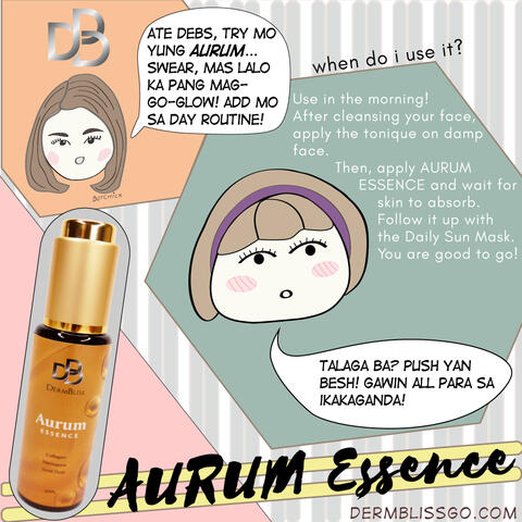 I don't mean to brag mga Deebies, but since using DermBliss, my selfies don't need any filter. Char! Nag-post nga ako the other day, biglang tumawag etong si beshie.Oh true ba? Kung may unli-rice at unli-samgyupsal, there's also unli-ganda pala!So of course, hoard galore ang Ate Debs nyo at baka maubusan!Para san ba this Aurum Essence? Let me tell you besh!Lightens skin - keri sa mga gustong even ang skintoneBoosts collagen production - anti-aging daw mamshRetains moisture - fresh na fresh ka nitoDiminishes dark spots - alam na this... alisin ang hindi nunal tehTightens skin - para sa mga may sayad (skin sa face!)And finally, eto mahaba-habang palaban na English:Protects skin from UV damage by helping skin produce higher antioxidantsAyyyy, sounds super important 'di ba? No to damage skin... please make my skin perfect, Aurum Essence! Dagdag na this sa morning skin routine mga Deebies.Send me your selfies... pagandahan tayo - char!