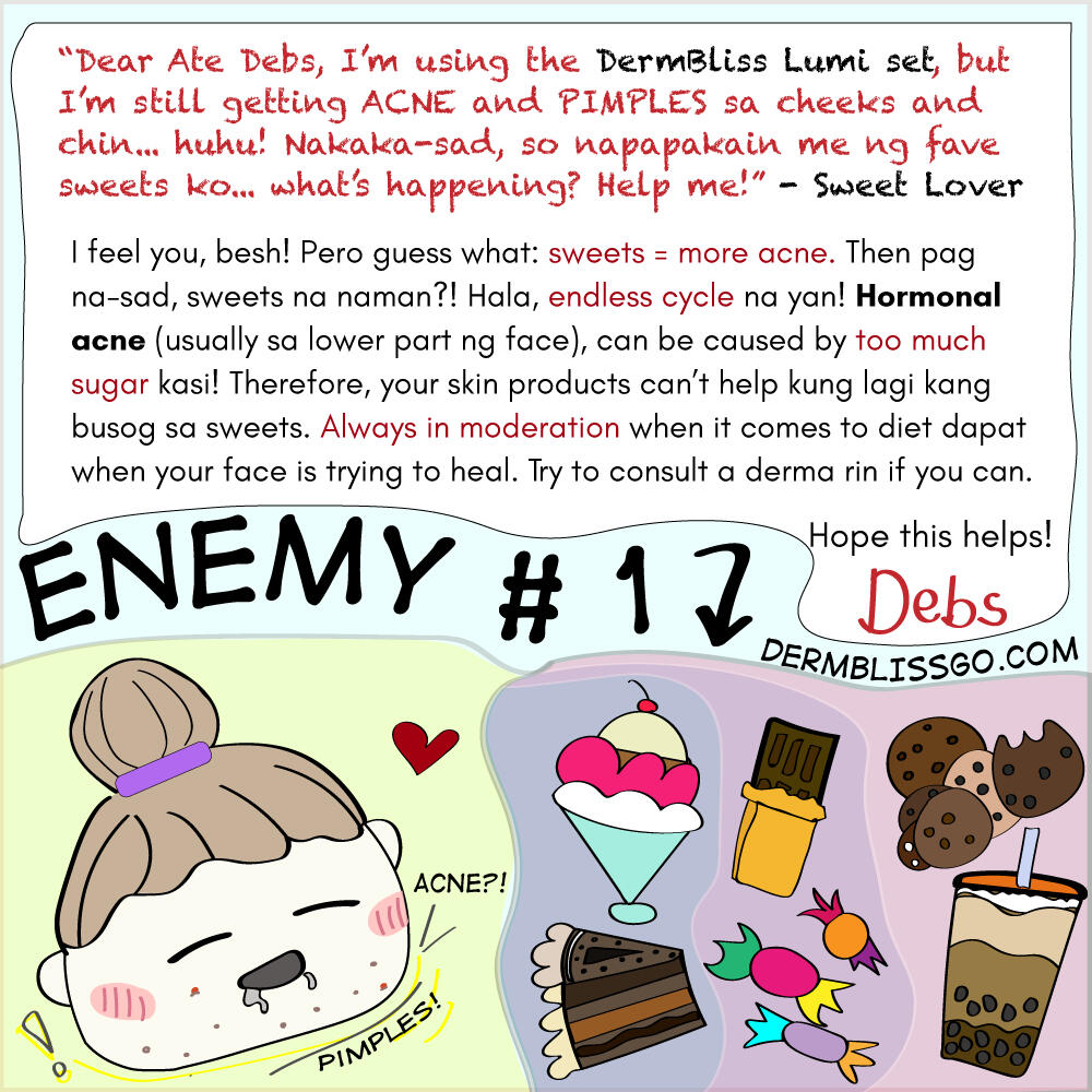 Happy Weekend, sweet Deebies!Ciempre, in the Debbie household, weekend means watching our favorite dramas while eating delicious snacks. And it's important to have healthy options like lightly salted popcorn, malunggay chips, sugarfree chocolates, etc. I've learned my lesson beshies: sometimes, too much of a good thing can undo days of hard work kasi, and by that, I mean skin care (making pahid creams, applying sun protection...)In fact, let me share with you a message I received over the week. Baka marami sa inyong maka-relate:A lot of us are sugar addicts I know! Who can resist ba chocolates, ice cream and soft cookies... yum yum! Pero remember Deebies: Sugar can trigger Hormonal Acne! When we consume too much sugar kasi, it may result to overproduction of chemicals in our body that may cause bloating, mood swings and skin issues. Kahit anong skincare pa gamitin mo, it cannot completely solve hormonal acne, because it's fighting against something that's being produced inside the body na.If you're using the DermBliss Lumi Set para matanggal acne and pimples, make sure you also do something about what you're putting inside your body rin. Make bawas sa sweets, dairy, carbs and oily food -- and DermBliss can slowly but surely eliminate your skin problems. Tsaka mo lang makikita yung progress pag nabawasan ka na ng sugar sa katawan. Don't be disheartened agad like Ms. Sweet Lover tapos you'll turn to unhealthy snacks... no-no! Be patient pa... kaya mo yan!(Take note: It's best to consult a derma to know the real underlying causes of your skin issues, besh. You may need medical intervention to cure hormonal imbalance. Or, you may have a serious medical condition that needs proper attention from professionals.)Skip muna the sugar and get na your DermBliss Lumi set!